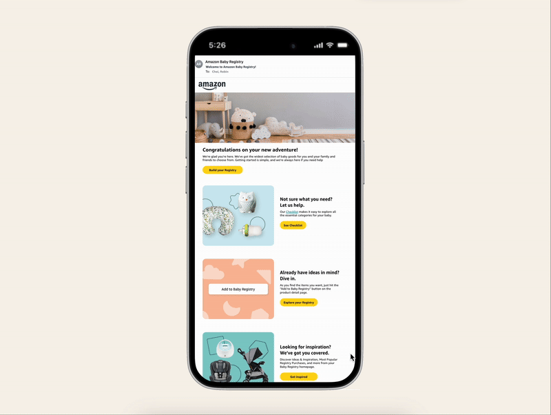 This refreshed campaign moved away from the earlier playful tone and leaned into a cleaner, more editorial visual language to align with Amazon’s internal design evolution while still preserving the warmth and accessibility of the registry experience.